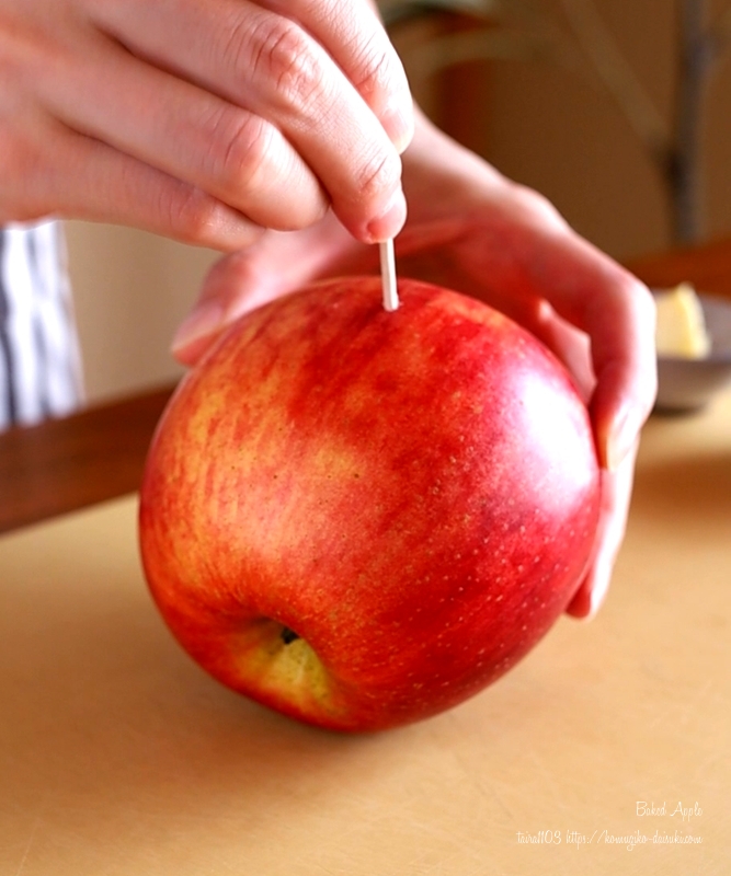 ①りんごの表面全体を串でさして穴をあける。(爆発防止のため)